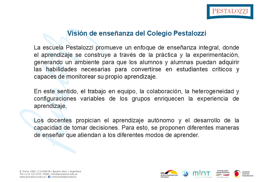 Somos un colegio bicultural argentino-alemán y laico, que fue creado en 1934 por la Asociación Cultural Pestalozzi, una asociación civil sin fines de lucro fundada por familias que querían sostener el idioma alemán y transmitir a sus hijos e hijas la cultura europea y, en particular, la alemana, en oposición a la ideología fascista imperante en la época.